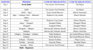 Royal Rajasthan tour offers a unique and inspiring introduction to this fascinating country. With visits to Delhi, Deogarh, Jodhpur, Udaipur, Pushkar, Samode and Jaipur as well as the awe-inspiring home of the Taj Mahal, Agra. Take a rickshaw ride through the streets we inspiring home of the Taj Mahal, Agra. Take a rickshaw ride through the streets of Delhi; enjoy a jeep safari through the traditional villages of Jodhpur, a boat trip on the Lake Pichola and an unforgettable ride up to the Amber Fort. Visit the Red Fort, the havelis of Jaipur, Junagarh Fort and the beautifully sculptured Jain Temples of Udaipur. Enjoy a Bollywood Movie show at the beautiful Raj Mandir theatre and stay in a Palace that many royals and celebrities have frequented over the years. There’s so much to see and do, you’ll want to come back again and again! That’s 15 days in a colourful, vibrant and, you’ll want to come back again and again! That’s Royal Rajasthan is a colourful, vibrant and spiritual land on an adv spiritual land on an adventure you won’t forget.