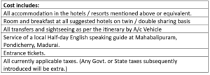 After breakfast proceed for sightseeing tour of Mahabalipuram visiting shore temple, Arjuna’s Penance, Krishna Mandapam, Five Rathas and beach. Later free to relax at Hotel Overnight stay at hotel