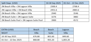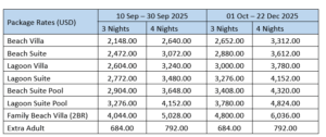 - Accommodation on All-Inclusive for 02 guests for all the room categories, except for Family Beach Villa, Beach Residence and Lagoon Residence. Rate for Family Beach Villa, Beach Residence and Lagoon Residence are based on 04 guests.