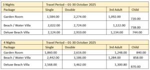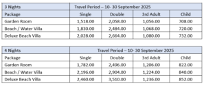 This offer is subject to information at the time of reservation. A copy of either wedding certificate, invitation card, or other Reasonable proof of recent marriage must be sent to the resort not less than 5 days before arrival otherwise, normal rates will be applied.