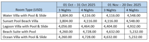 - Complimentary excursions (SUNSET CRUISE, LOCAL ISLAND Experience or SNORKELING SAFARI) once per stay