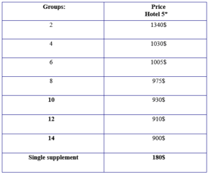 - Supplement for Dinners is 120 USD per person per tour in tourist-class restaurants