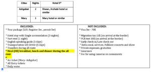 *Meet and see off at border check point Sarazm *Transfer according itinerary – by van with A/C *TWN/DBL accommodation